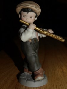 I started playing flute when I was 12, and almost immediately after starting lessons, I began collecting flute player figurines. My teacher gave me my first one and my collection has grown exponentially since then. It’s not terribly easy to find flute player figurines that aren’t angels, and even with angels, they tend to be seasonal, arriving on store shelves only at Christmas time. When you find one that’s unique, you have to get it when you see it. I have many unique figurines in my collection – a giraffe, Friar Tuck, and a dragon playing a flute just to name a few. This little boy outdoes all my other flute players, combined as far as his meaning in my collection.