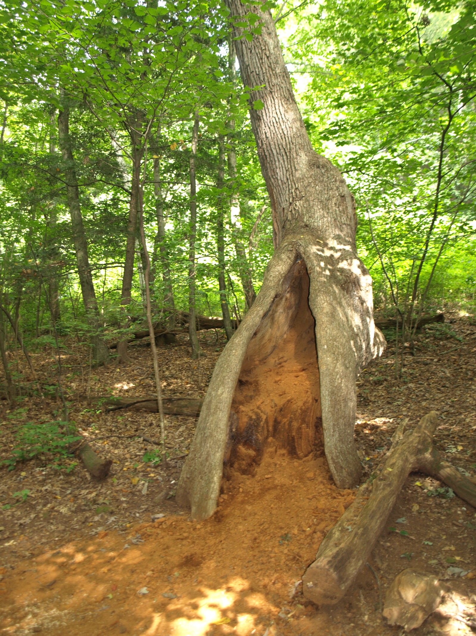 The first picture is a sycamore tree that is north of my apartment about a half mile down the street. Nobody really knows how old it is, but I’d say it’s at least 300 years old. It’s 113 feet tall, almost 25 feet wide and the spread of the branches is 140 feet. I dont’ think you can really get a sense of how massive it is from a photo, but it’s a majestic sight. The second photo is a bizarre tree I found on a hiking trail on Mount Sugarloaf in South Deerfield, MA. At first I thought it was hit by lightning, but upon further inspection, it looked like it completely rotted into sawdust. Very strange, but inspiring.