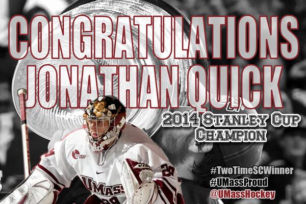 One of the truly cool things about being a devout fan of college athletics is that some of the players you cheer for make it to the big time. Besides the few NFL players I know, I had the pleasure of watching Jonathan Quick play for our hockey team. A two- time Stanley Cup champion, he’s been an integral part of the L.A. Kings starting lineup and will always have a place in the hearts of UMass Hockey fans. Congratulations Jonathan, UMass Nation is proud of you!